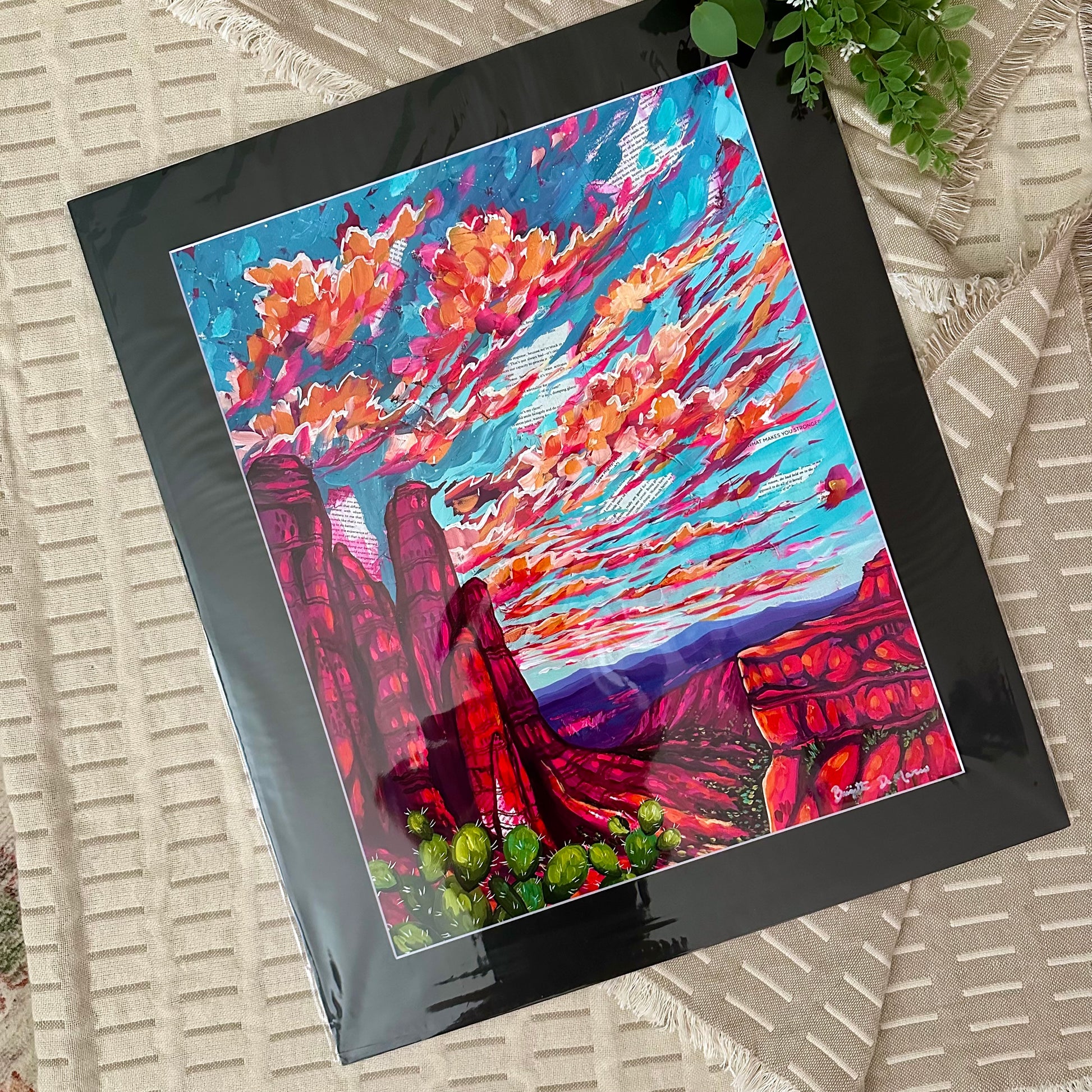 "End of Trail" is an acrylic and mixed media artwork. Featuring a view from the top of cathedral rock, this piece captivates with its vibrant color and interesting texture, making it the perfect addition to any art lover's collection. Prints come in 11x14 and 16x20.