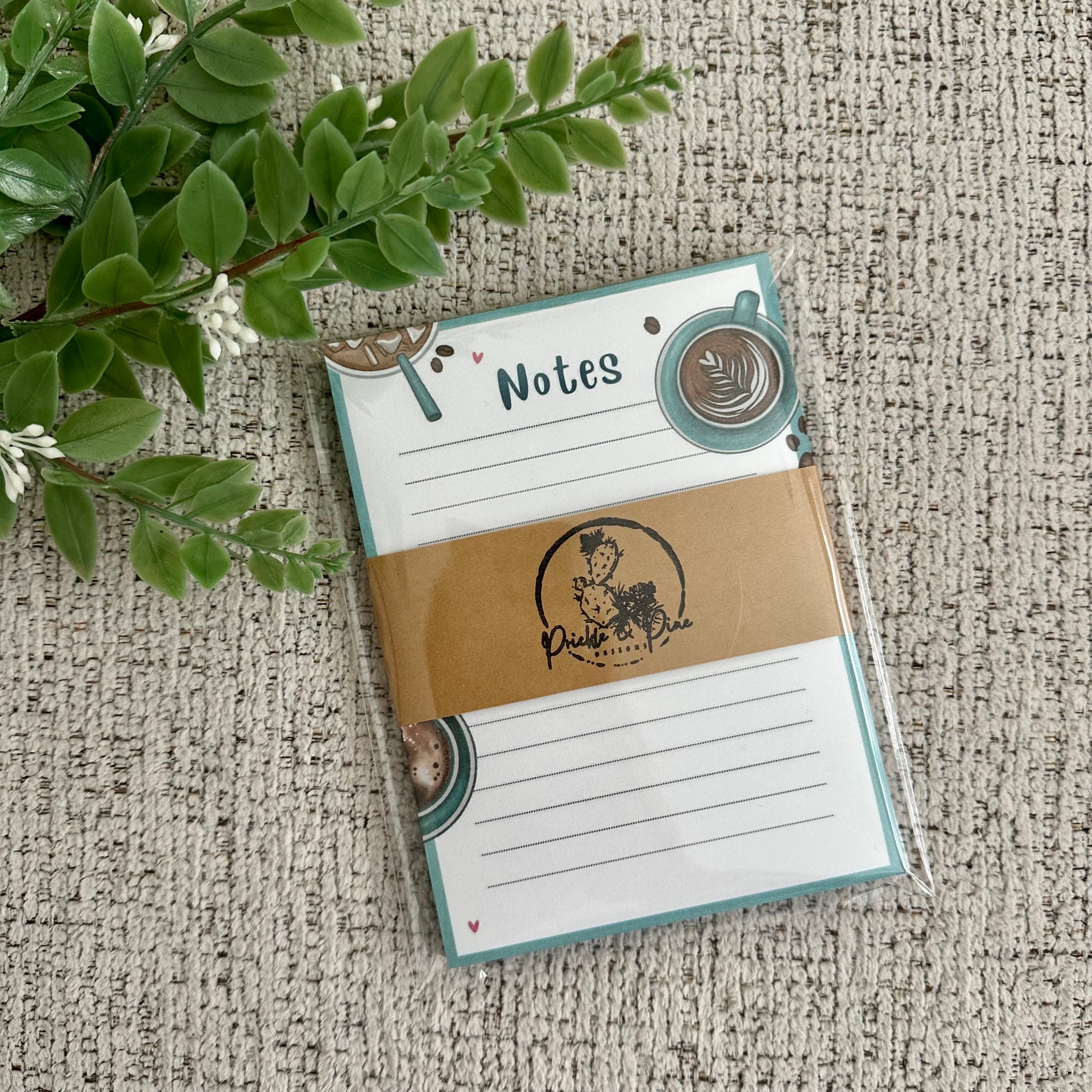 Adorable notepad with a hand drawn coffee design. Notepad is 50 pages and 4x6