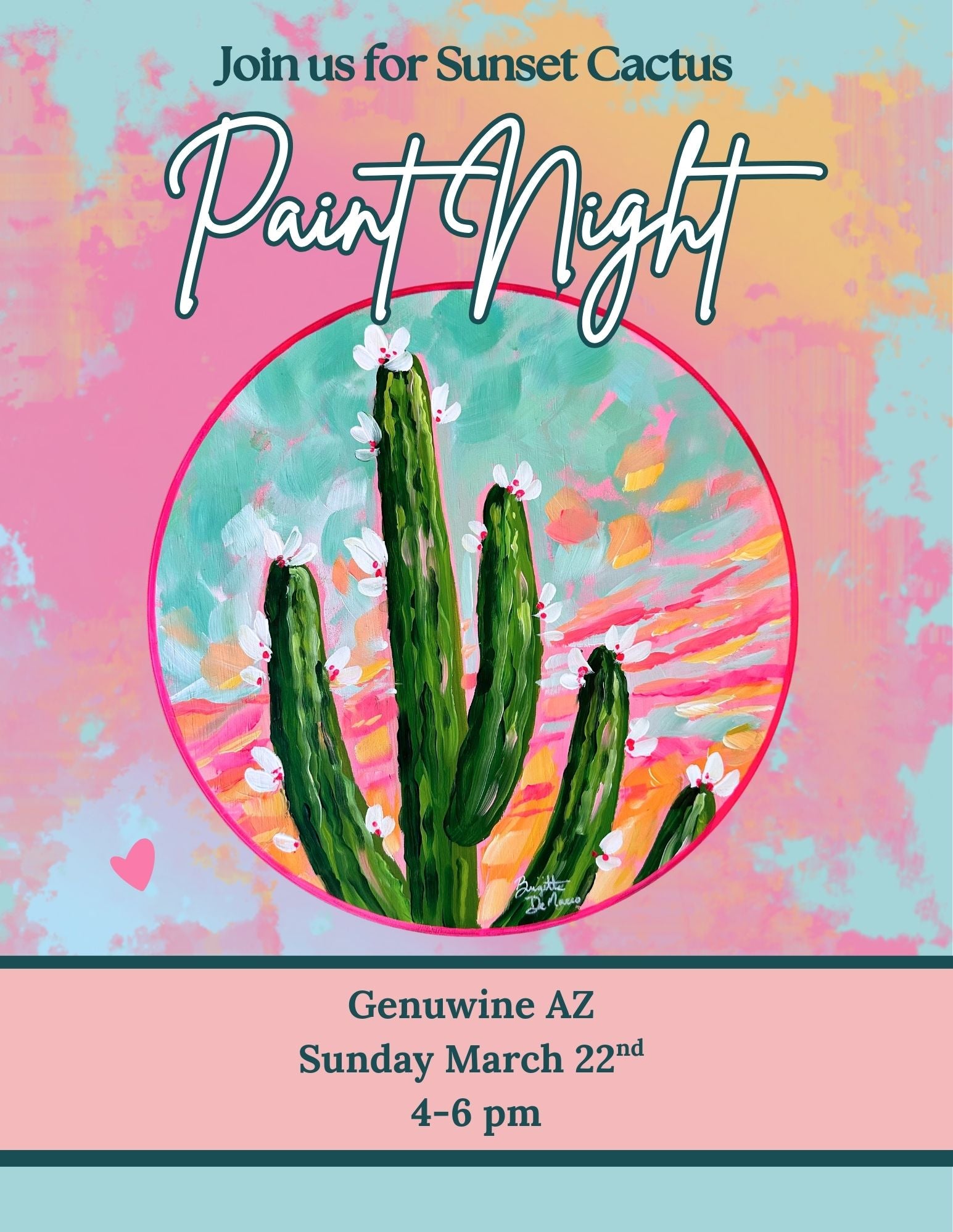 Join me for this desert sunset paint & sip design at Genuwine in Phoenix, AZ! (888 North 1st Ave. #101, Phoenix, AZ 85003). During this event, you'll learn basic acrylic painting techniques to help you create this colorful effect. All supplies is included, beginners welcome!