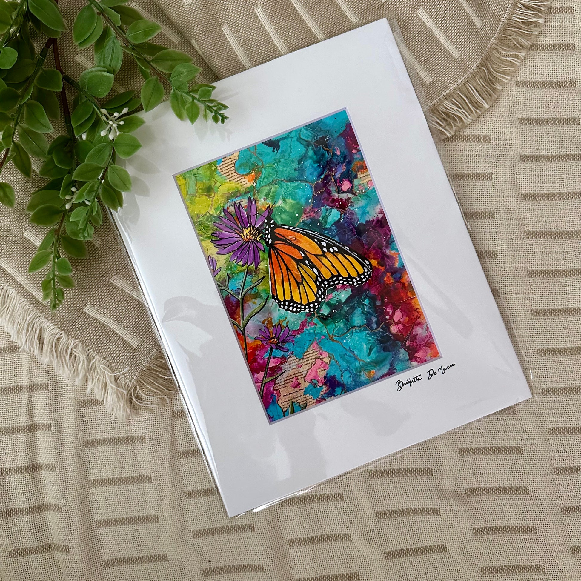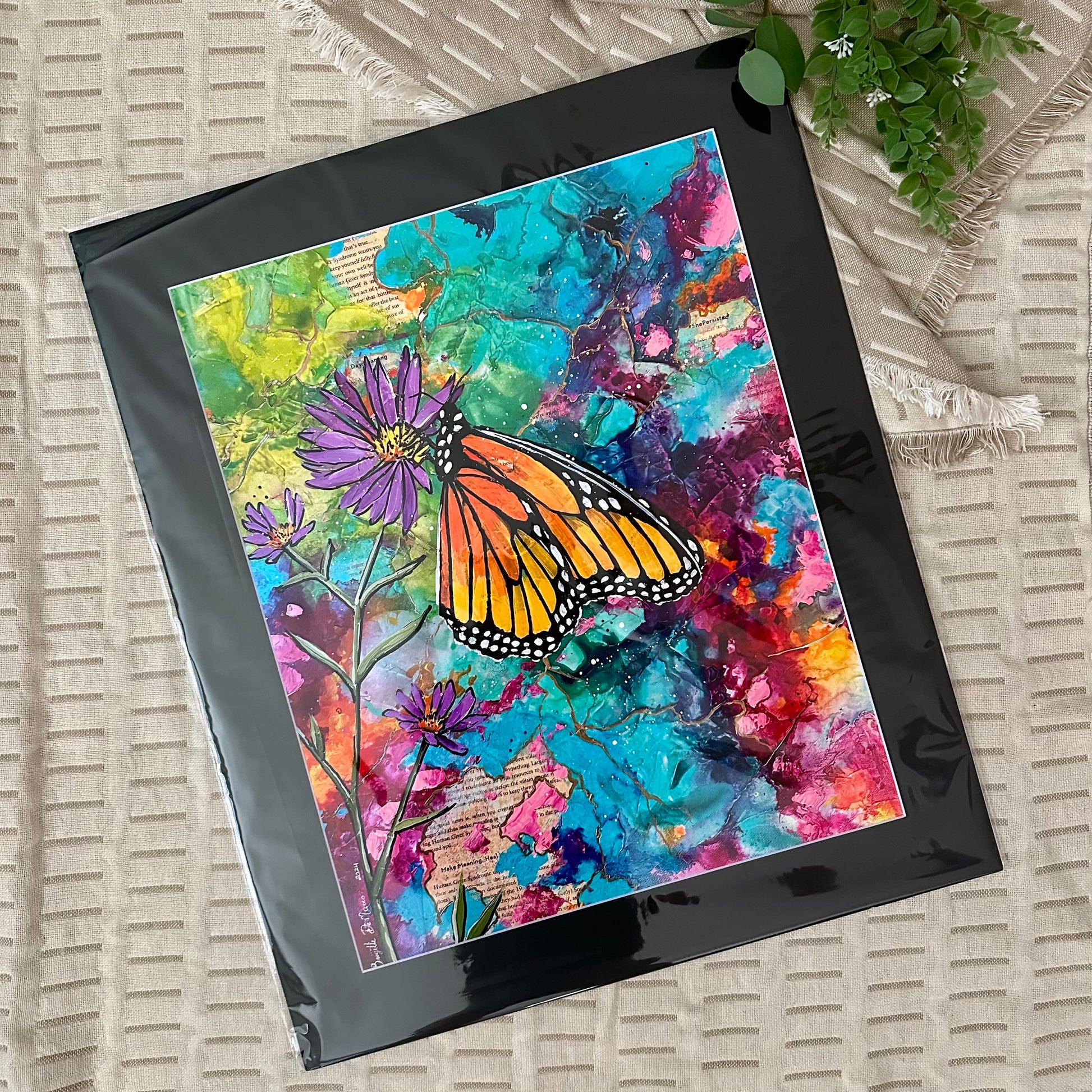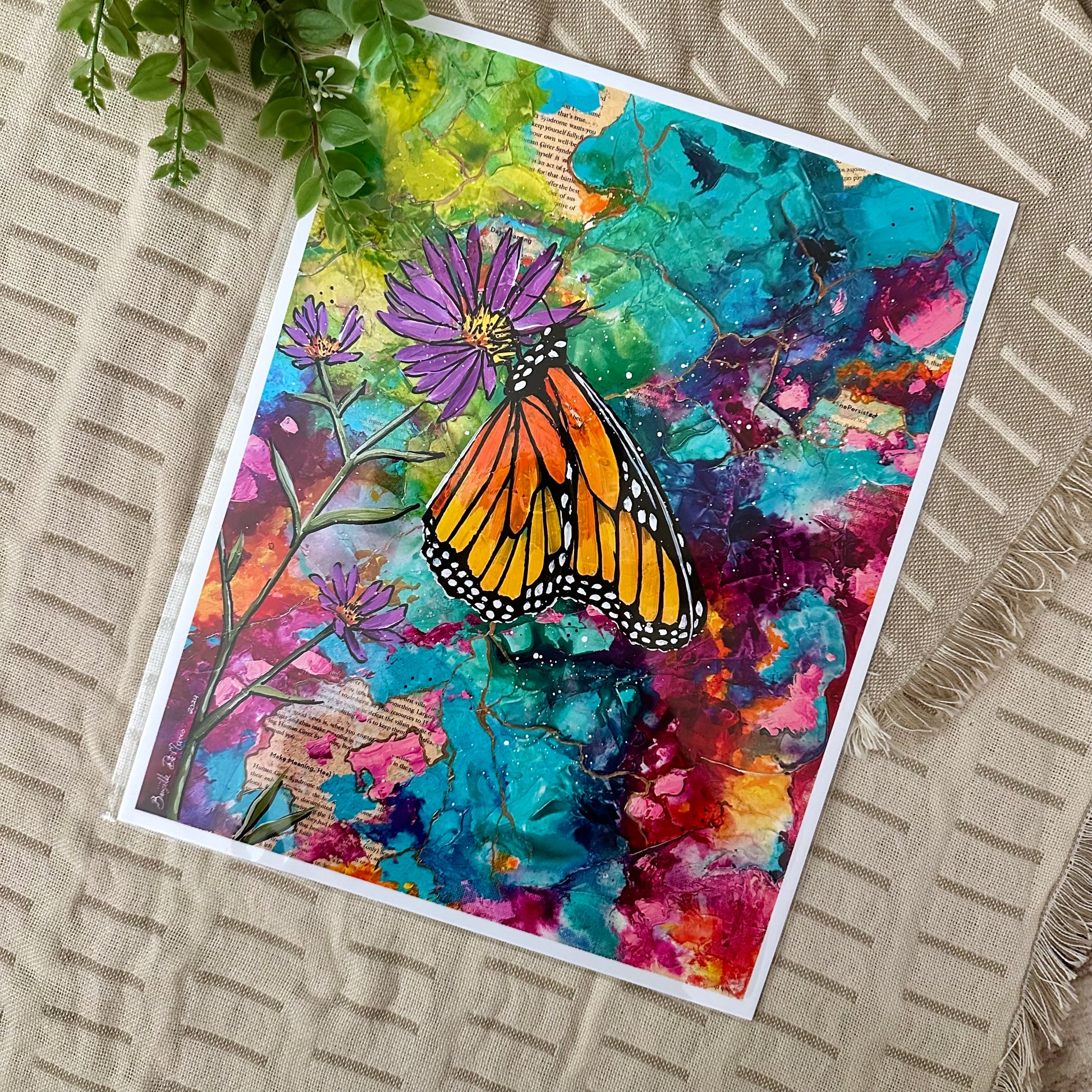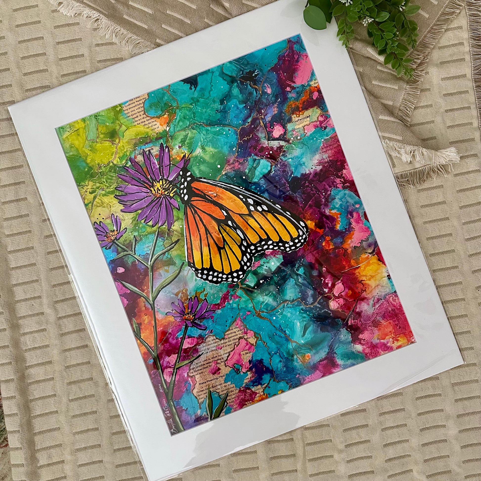 Persistence & Transformation is a mixed media painting featuring a Monarch butterfly. The vibrant abstract background, created through thick paint strokes, reveals fragments of text, adding depth to this captivating artwork.