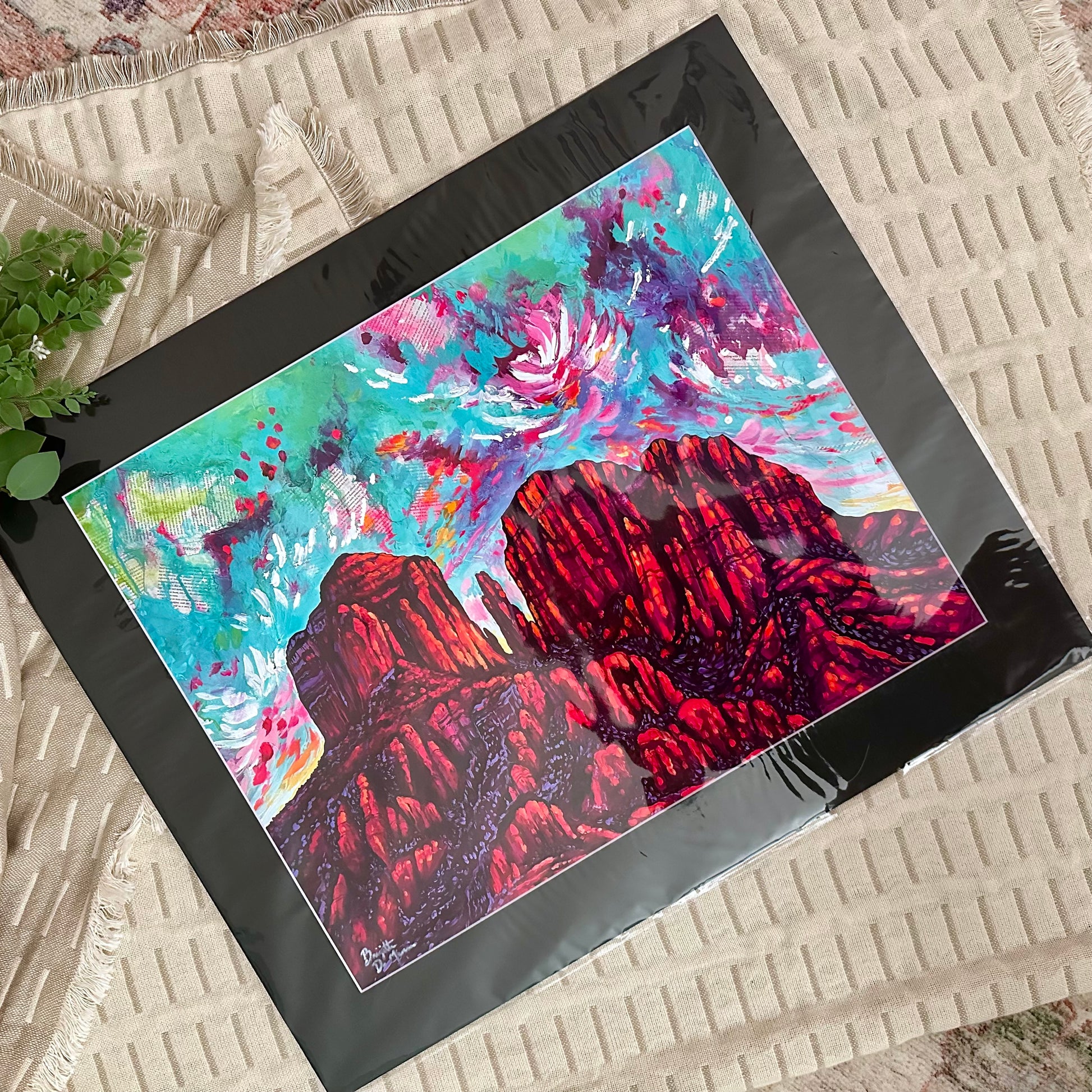 "Rest and Persist" features a famous view of cathedral rock from a ground perspective. The vibrant abstract background, created through thick paint strokes, reveals fragments of text, adding depth to this captivating artwork. Prints are available in 5x7, 11x14, and 16x20
