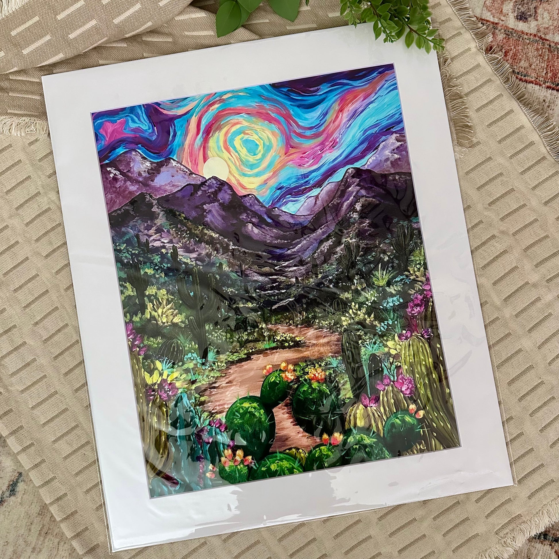Original design featuring a painted scene of a popular hiking trail in the White Tank Mountains in West Valley, Phoenix. Print shipped with a card board backing and protective sleeve and come in 5x7, 8x10, 11x14, and 16x20.